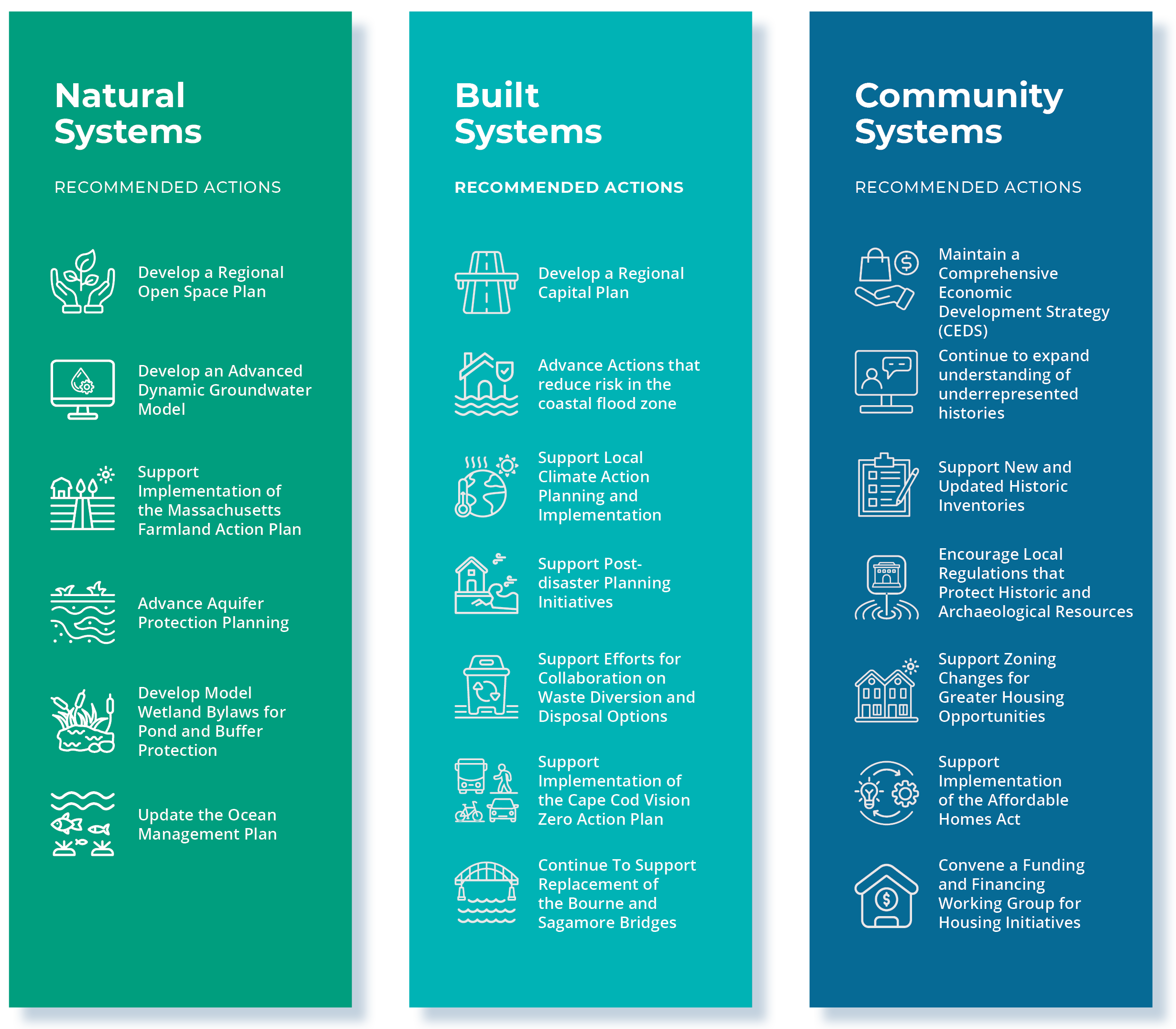 The RPP identifies actions that the Commission commits to undertake including planning efforts to advance the key priorities. These actions are organized around the Natural Systems, Built Systems, and Community Systems. Many of these actions will require collaboration and partnerships with various entities and stakeholders to achieve. In addition to planning actions, the Commission will continue to regularly review its Development of Regional Impact thresholds to ensure they are encouraging appropriate and sensitive development patterns. There is an additional recommended action to measure progress across the Cape Cod Systems by developing a comprehensive online viewer to track progress across major regional plans. This action draws on the performance tracking emphasis in each issue-specific regional plan to centralize monitoring of key metrics while fostering regional coordination and data-driven decision-making.