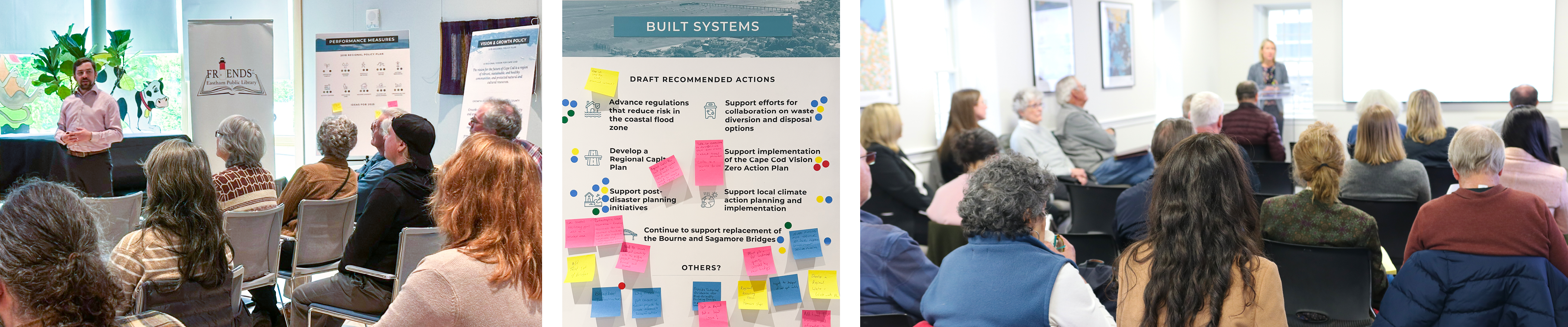 Public update meetings were held in March to provide an overview of the process to date and get feedback and input from attendees. Based on input from these meetings, the focus groups, the survey, and other comments received to date, Commission staff drafted potential changes. Subregional meetings on those proposed changes were held in May. Feedback on the proposed changes was incorporated into a completed draft, which was released for a public comment period after review from the Regional Policy Plan subcommittee and Cape Cod Commission in June 2025. During the public comment period there were additional public hearings and further opportunities to obtain feedback on the completed draft. Based on feedback received on the draft, the RPP was refined and was presented to the Cape Cod Commission, Assembly of Delegates, and Barnstable County Commissioners for approval and adoption as a county ordinance.