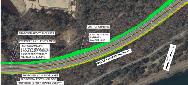 This project includes installation of a new center median, expanded roadway shoulders, drainage improvements and a new shared-use path along the Scenic Highway between Nightingale Road and Edgehill Road. The contractor has begun initial work, which currently includes tree clearing.