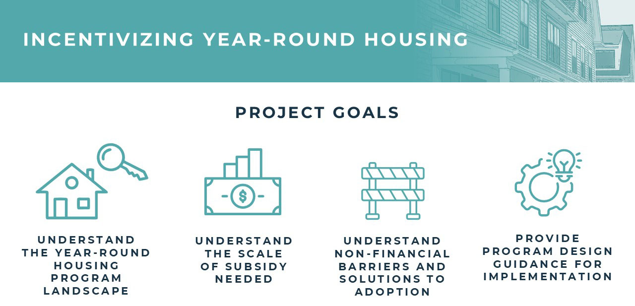 To advance this recommendation, the Commission contracted with consultant Outwith Studio with funding provided through the Massachusetts Executive Office of Housing and Livable Communities' District Local Technical Assistance program to research the structure and implementation of year-round incentive programs nationally. The report provides an overview of the year-round incentive program landscape; helps to give a sense of the scale of subsidy needed for such programs on Cape Cod; identifies what some of the non-financial barriers and solutions to implementation and program participation; and provides program design guidance for potential implementers.
